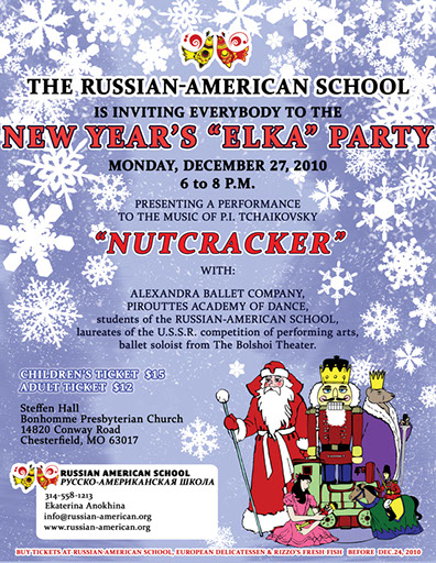 ЁЛКА Каждый год Русско-Американская Школа проводит новогоднии праздники-спектакли с Дедом Морозом, Снегурочкой и другими сказочными героями. На новогодней Ёлке 2010 года был спектакль по мотивам сказки Щелкунчик, созданный силами актёров русской эстрады и балета, детей из театральной студии Мозаика, родителей и учителей школы, балетные номера были представлены школой балета Alexandra Ballet Company, города Ст. Луиса.